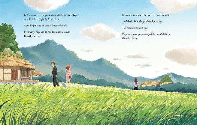 Lily lives in Washington, DC. Her grandpa lives in Korea. They’ve never met but are good pen pals. Just when he is about to visit Lily in the U.S., Grandpa dies. Lily and her mom fly to Korea, where they uncover the rice paper scroll Grandpa had hoped to finish painting with Lily. To honor his wish, Lily writes a poem about her grandfather that sits just below his poem about her, so that in the end, they have finished it together.