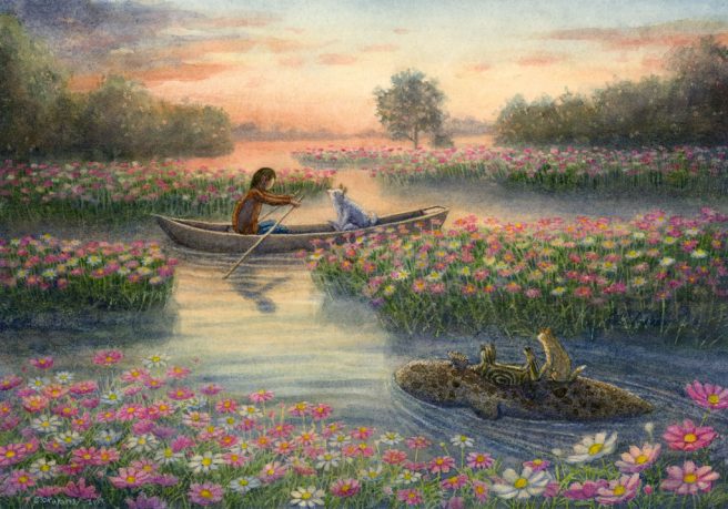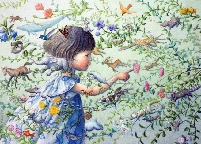 I stumbled upon his work on Pinterest and was immediately taken with his beautiful colors, extraordinary level of detail, and gentle depictions of children and animals, who are portrayed on equal footing and living in total harmony.