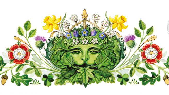 The original artwork for the invitation was hand-painted in watercolour and gouache, and the design will be reproduced and printed on recycled card, with gold foil detailing. Central to the design is the motif of the Green Man, an ancient figure from British folklore, symbolic of spring and rebirth, to celebrate the new reign. The shape of the Green Man, crowned in natural foliage, is formed of leaves of oak, ivy and hawthorn, and the emblematic flowers of the United Kingdom.