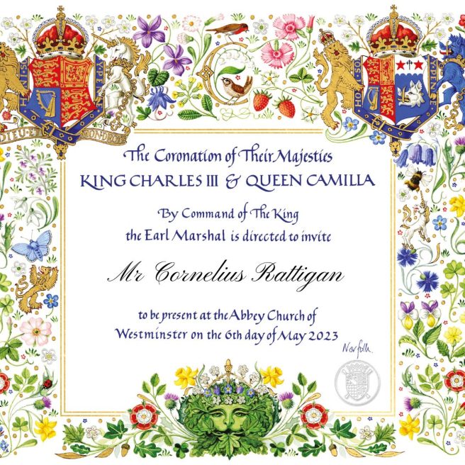“The invitation for the Coronation has been designed by Andrew Jamieson, a heraldic artist and manuscript illuminator whose work is inspired by the chivalric themes of Arthurian legend. Mr Jamieson is a Brother of the Art Workers’ Guild, of which The King is an Honorary Member.