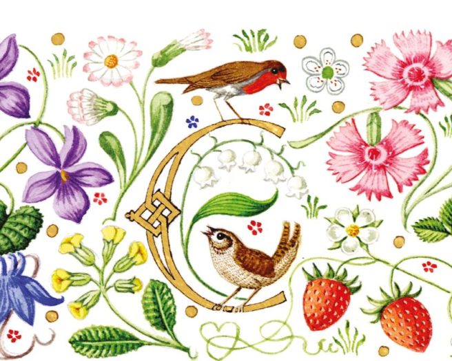 The British wildflower meadow bordering the invitation features lily of the valley, cornflowers, wild strawberries, dog roses, bluebells, and a sprig of rosemary for remembrance, together with wildlife including a bee, a butterfly, a ladybird, a wren and a robin. Flowers appear in groupings of three, signifying The King becoming the third monarch of his name.