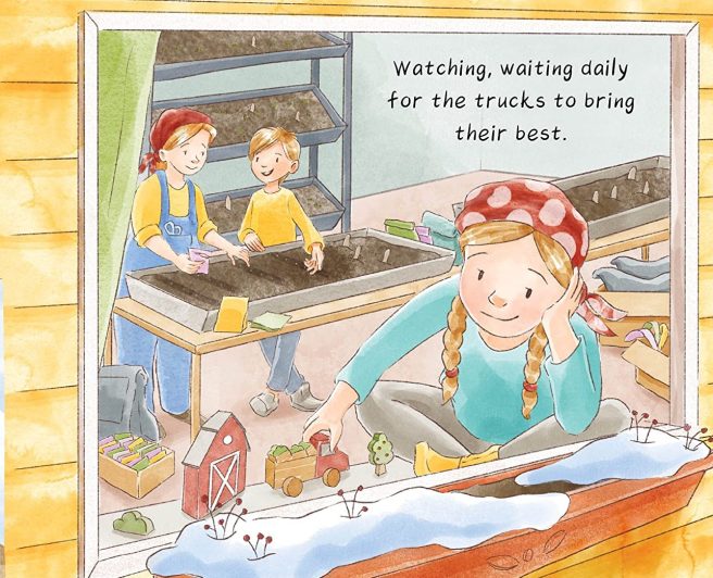 The girls and their families hug goodbye when the market closes for the winter. Though this is the season of waiting, wondering, and watching snowflakes fall . . . they can also look forward to “that first red fruit when springtime blooms again,” signaling their reunion when they can share another year of deliciousness.