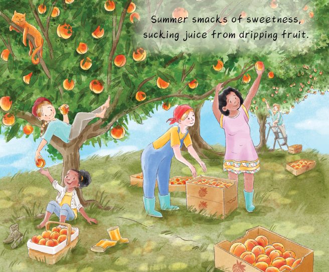 Beginning with spring’s strawberries (“staining lips heart red”), they enjoy sugar peas, “juicy lettuce, crispy kale” and “bouquets of sweet young spinach.” Summer brings the sweetness of dripping fruit like nectarines, peaches, and plums (they “slurp them down, one by one.”) What about peppers, melons, corn on the cob, and “a rainbow of tomatoes”? Yum!