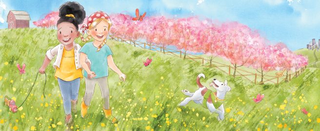 Gortman has created a heartwarming visual narrative that beautifully extends Pryor’s spare, lyrical text. Her pictures show the farm family planting in the spring, the two girls meeting at the farmers market (farm girl is white, city girl is biracial), the girls wandering from stall to stall, the two families on a summer day in the city and then picking peaches together.