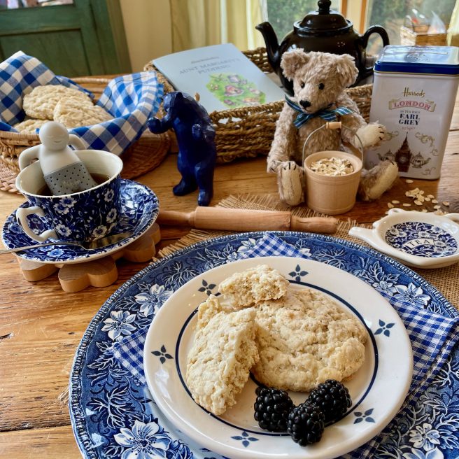 There are seven recipes in Brackenbury’s book: Aunt Margaret’s Pudding, Bakewell Pudding, Flamberries Pudding, Raspberry Buns, Cheesecakes, Vinegar Cake and Quaker Oat Scones.