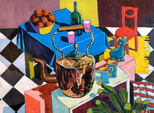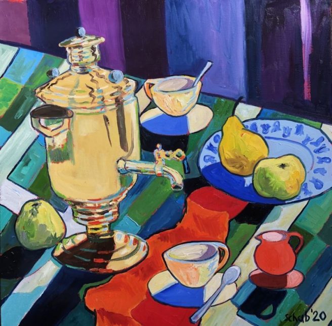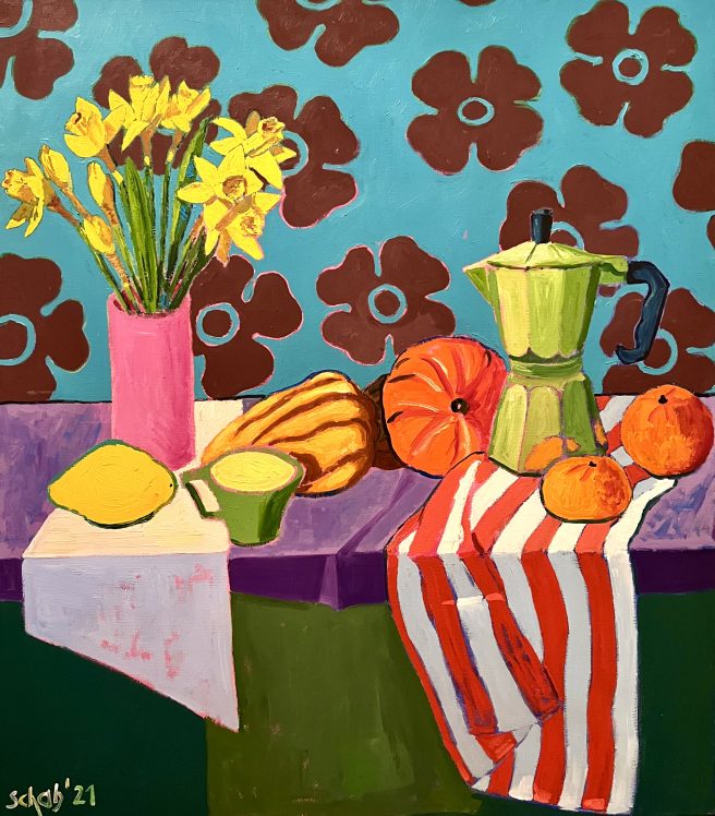 Though Schab also paints landscapes and portraits, his still lifes are my favorite. I’m fascinated by the selection and arrangement of objects, each of which has a story of its own. Unlike reading a linear narrative, where a plot unfolds gradually and characters are revealed in turn, when you look at a picture you see everything all at once. As your eyes travel from object to object, you consider juxtapositions, make connections, or even begin to create your own story, moment by moment.