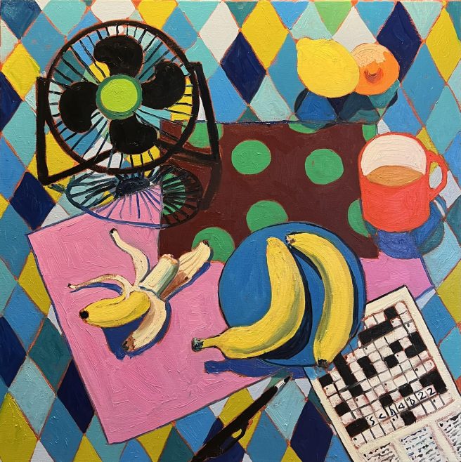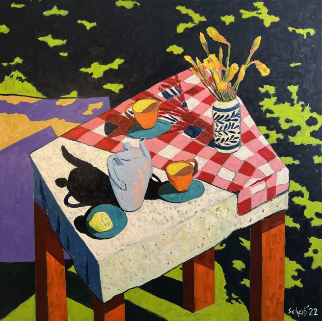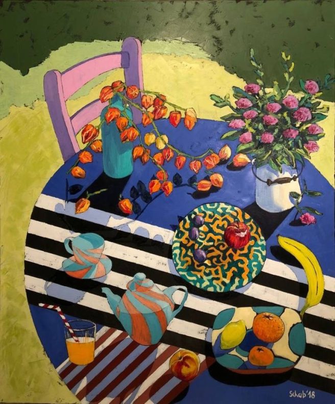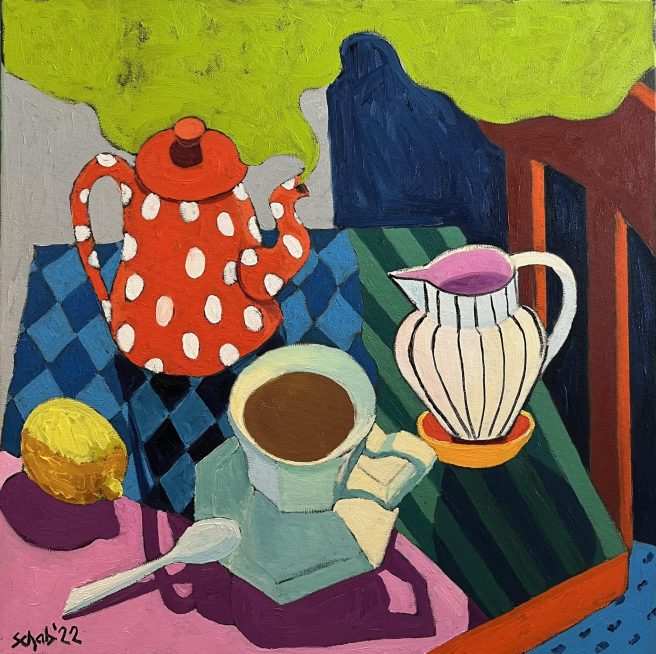 I enjoy feasting on Schab’s pictures – the cups, jugs, fruits, plates, flowers, vases, and cool table linens (diamonds, stars, stripes!). Who could resist a red polka dot coffee pot? And anyone who paints teddy bears is okay by me. 🙂
