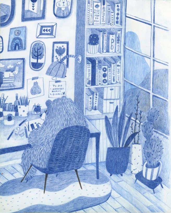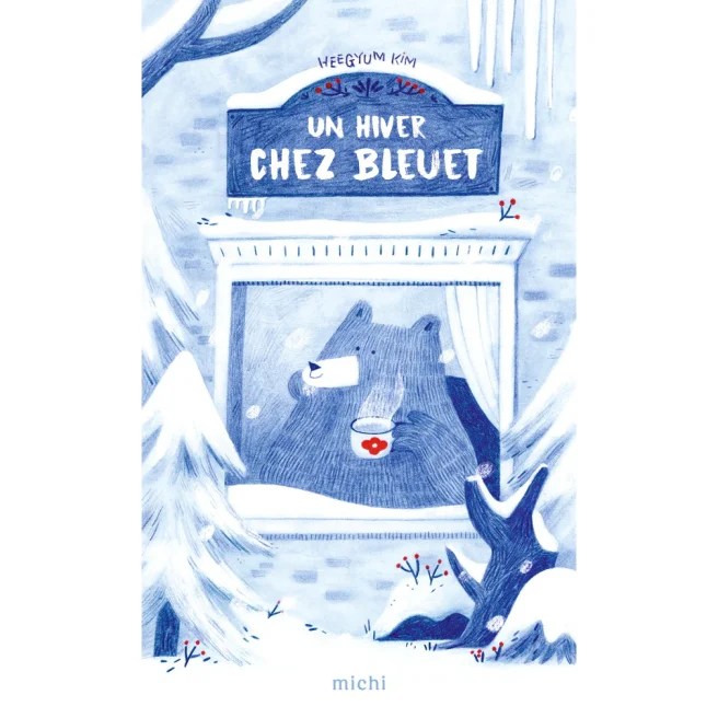She recently published her first children’s picture book, Un Hiver Chez Bleuet (Michi, 2023). This project actually began during the pandemic, when she shared a drawing of a blue bear on Instagram (she’d always loved the color blue and often made pictures entirely in blue). Her followers loved it so much that she started a Blue the Bear series, which she made into a postcard book.