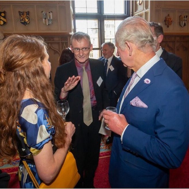 Emily and fellow British illustrator John Shelley with King Charles at Windsor Castle (Ian Jones Photography).