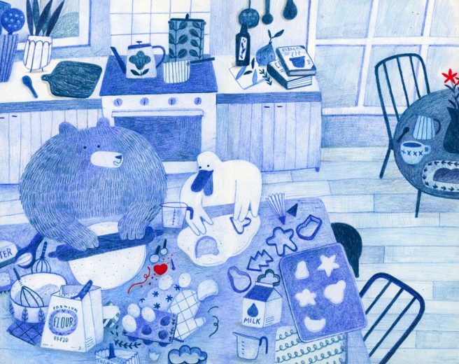 She was then contacted by a French editor, asking if she’d like to do a Blue the Bear picture book. I do like the idea of a homebody bear who enjoys doing simple things — reading, drinking tea, etc. One winter’s day he’s forced to leave the house because he’s out of blueberry pie (read more about this charming book here).