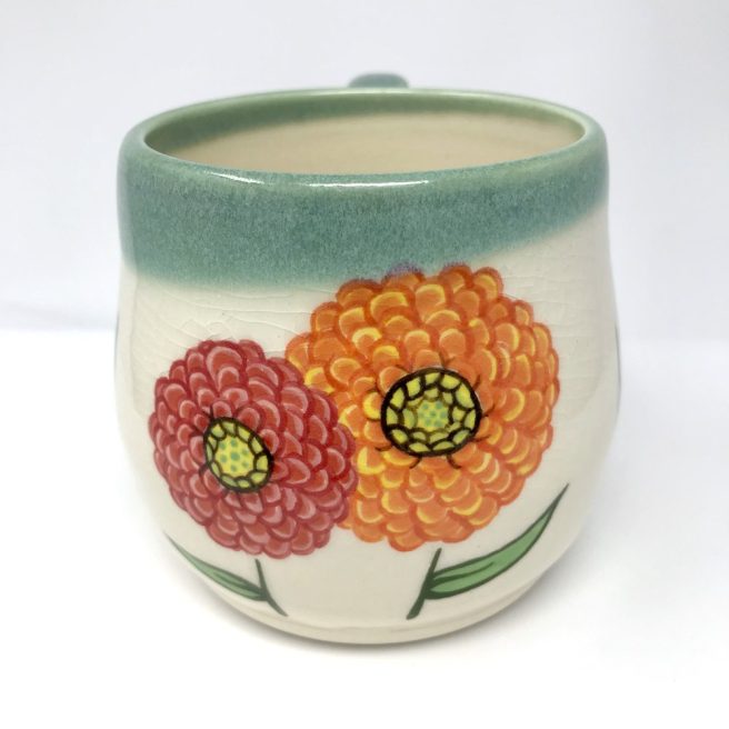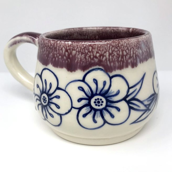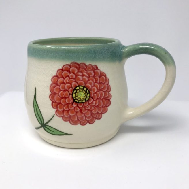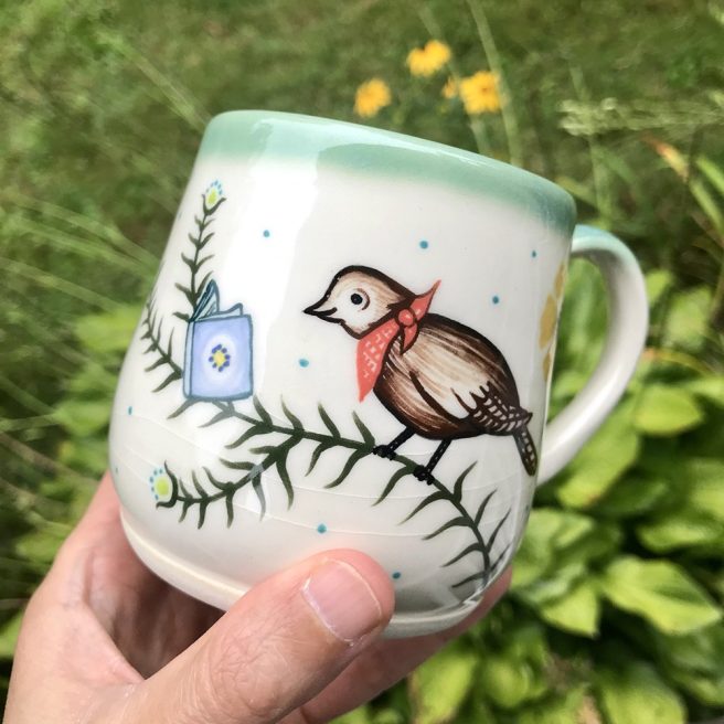 She decorates mugs, plates, platters and bowls in her signature style with flowers, birds and other animals. Small batches of handmade pieces are either handbuilt or wheel thrown with a white clay body, then painted with an underglaze using the same brushes she uses for her book illustrations. Finally, she applies a clear glaze coat with a subtle crackle finish.