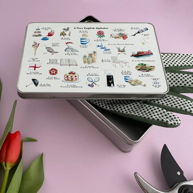 5. More Alphabet Love: Last year I featured a couple of Shelli Graham’s ABC tea towels — “A Very English Alphabet” and “A Very Scottish Alphabet.” Recently I saw even more of her wonderful designs at one of my fave places to shop online, The Bee’s Knees British Imports. They carry some of her greeting cards and tins in addition to tea towels.