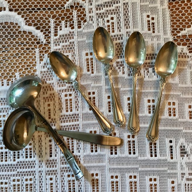 Much like the poem’s narrator, I have many things in my kitchen I hold dear: my godmother’s handmade apron, my mom’s and aunt’s handwritten recipes, my mother-in-law’s silverware (though I’m not as conscientious with keeping everything polished). She also gave us two stainless steel gravy ladles which we use all the time – the perfect remembrance, since she did make the best gravy ever.