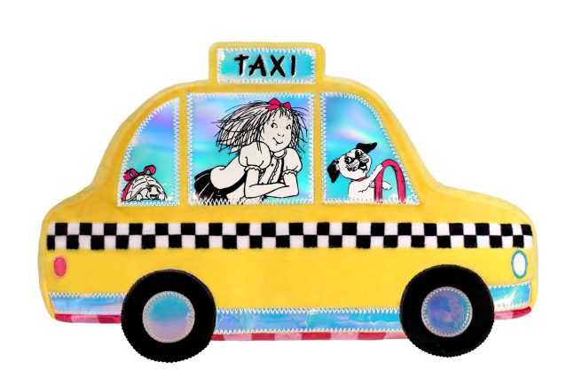 Made by Yottoy (one of my fave manufacturers of children’s book- related merch), this cuddle-worthy cab measures 15″ x 8″ x 4″ and features Weenie at the wheel with Skipperdee riding along. Eloise’s signature pink striped pattern is on the back of this yellow plushie which is soft soft soft.