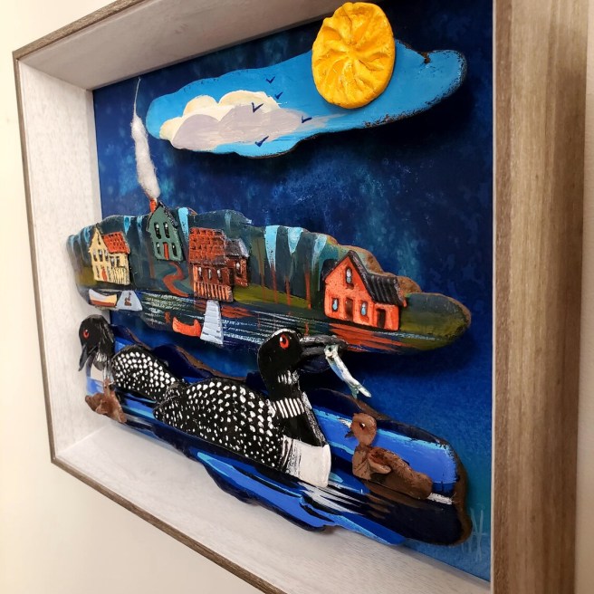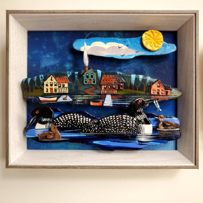 Finally, check out this scene of loons on a blue water lake with colorful cottages along the shore. This measures 11.5″ x 8″ x 2″, and is also a OOAK original.