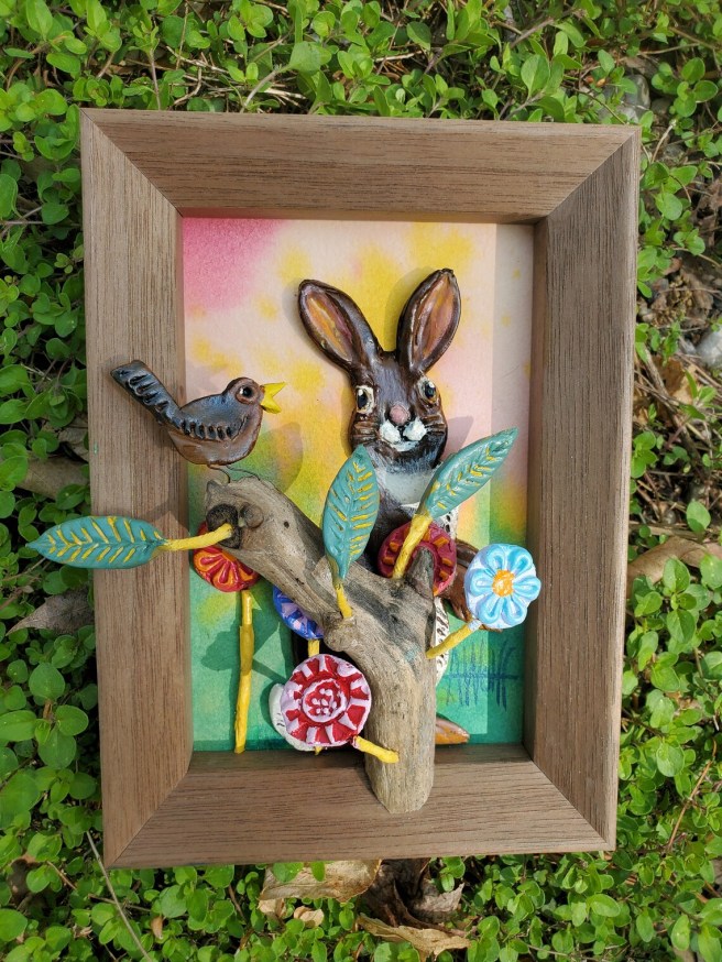 And what about this adorable bunny and his little wren friend? Both of these one-of-a-kind originals are 5″ x 7″ x 2″ and so charming!!