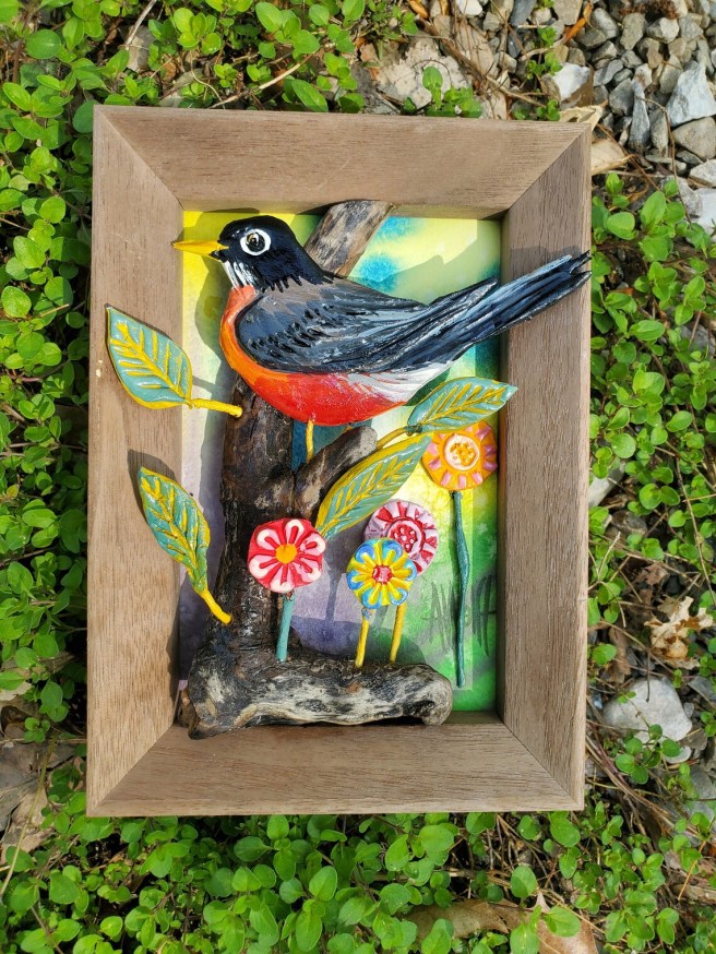 Don’t you love this robin perched upon a branch of driftwood? Wonderful 3-D effect, like our little winged friend is ready to flutter right out of its wooden frame. It’s set against an original watercolor backdrop.