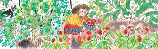 There, Grandma grows flowers as well as lots of berries — raspberries, blueberries, strawberries and gooseberries. Betty helps Grandma pick the fruit and cook it to make jam to sell at the farmers market.