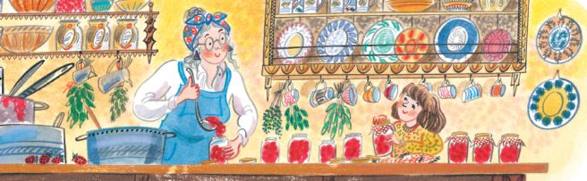 She does make you wish you could browse the market with its glorious largesse of fruits, veggies, cheeses, flowers, and breads; chat with fellow shoppers, then queue up to buy Grandma and Betty’s strawberry jam. It’s fun studying the interactions between the people. And of course, I’d love to live in Grandma’s kitchen, with its sunny yellow walls, crockery, jam jars, and baskets full of juicy berries. Adopt me, please!