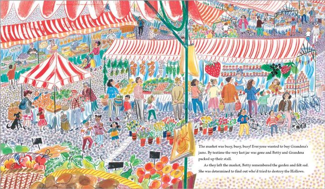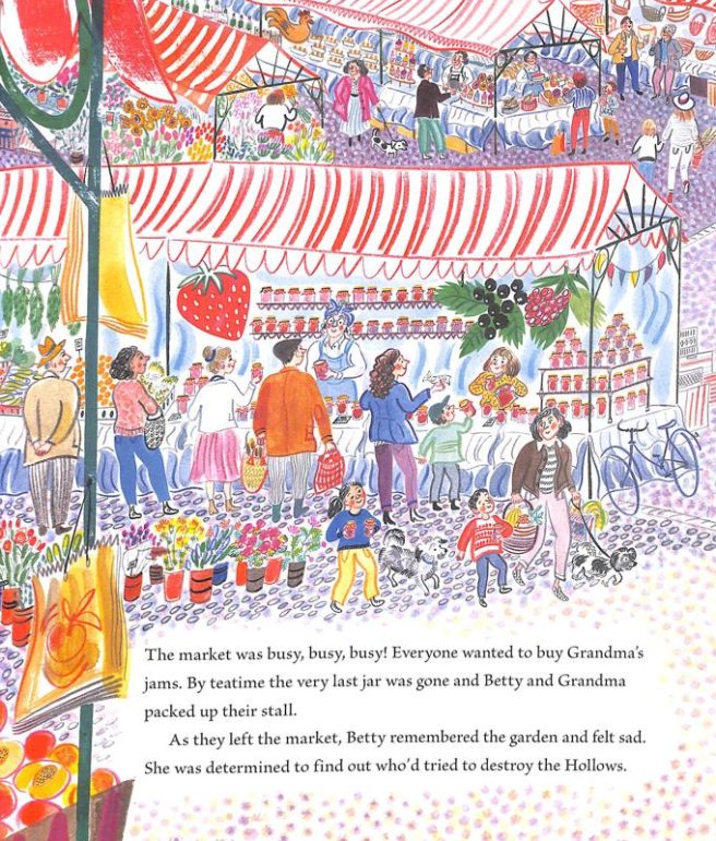 Many of the spreads emanate pure joy, from Betty happily swinging from the big oak tree, to her and Grandma picking berries and making jam together, to the delightful bustle of shoppers at the market.
