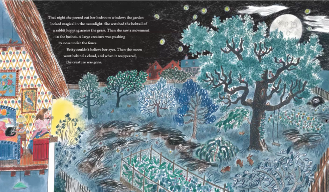 Betty is quite sad and determined to find the culprit. That night, when she peers out her window, she sees a large creature “pushing its nose under the fence,” but she loses sight of it when the moon drifts behind a cloud.