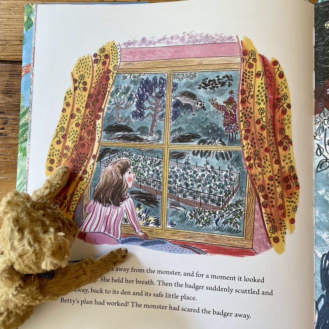 That night, as she watches by her window, she sees the bushes move, then spots the badger pushing its way under the fence again! As soon as it eyes Betty’s monster, it stops in its tracks.