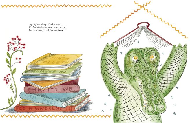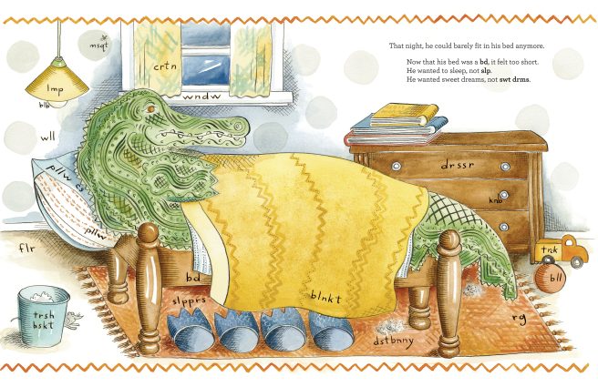 Kids will enjoy figuring out the vowel-less “words” on book spines and objects in Zigzag’s bedroom. And his bd being too short? The b and d together resemble head and foot boards. Yes, it looks like a very short bed! A stroke of genius!