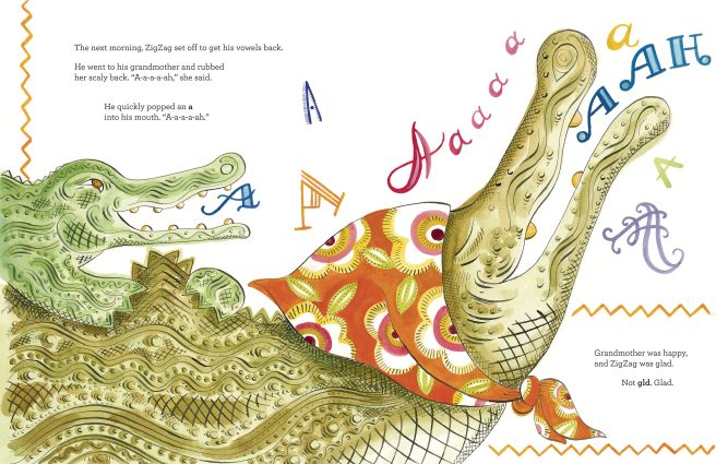 Only one thing to do: get his vowels back. Zigzag set off the next morning to visit his grandmother. When he rubbed her scaly back, she said, “A-a-a-a-ah.” He quickly popped an a into his mouth. When he saw a rat out the door, he scared it with a “SCRAM!,” then snagged an e when it gave off a “Squ-e-e-e-e-k!”