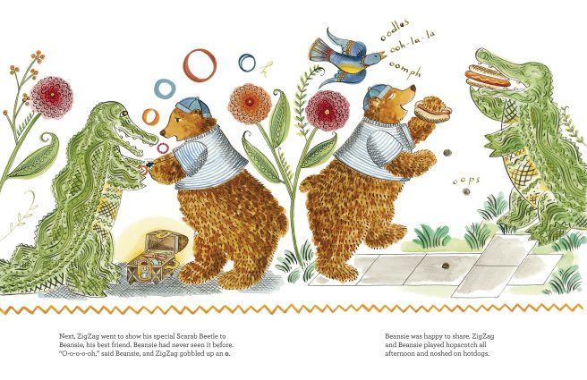 A longtime Julie Paschkis fan, I was already poised to like this book. Yet she managed to surprise and delight me at every turn. As an alphabet aficionado, I especially loved seeing Zigzag shaking consonants from a book, as well as all those artfully drawn vowels in upper and lower case emerging from the characters’ mouths as the story progresses (the double page spread of Zigzag thanking YOU with all those U’s is glorious). And need I mention how much I love Beansie the bear? Adorable! He’s pictured with several of my fave o words too: oodles, ooh-la-la, and oomph (I’ve always had a thing for double o‘s). And they’re eating hot dogs!! *swoons*
