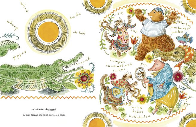 With a whoop and a whee and a yippee, Zigzag had all of his vowels back!! Call it miraculousness. Time to party. Zip zap, a gaga gala! A rumbustious ruckus and rumpus! A jubilee jitterbug jamboree with all his friends! Yep!