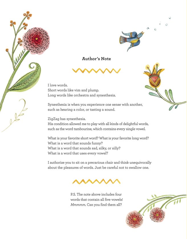 Backmatter includes an Author’s Note explaining that Zigzag has synesthesia: experiencing one sense with another. Julie challenges the reader to find other words, like tambourine, that contain every vowel, and she closes with this witty declaration: