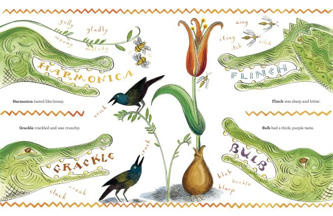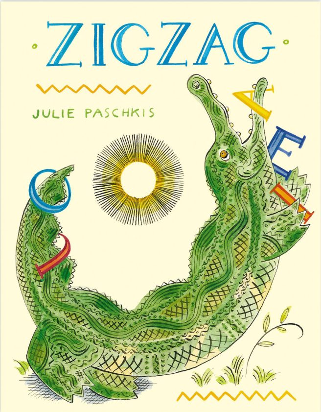 In Julie Paschkis’s Zigzag (Enchanted Lion Press, 2023) — a zippy, juicy, jazzy hullabaloo of a picture book — we meet a voracious crocodile who “liked to taste words.” He had quite the discerning palate, too.