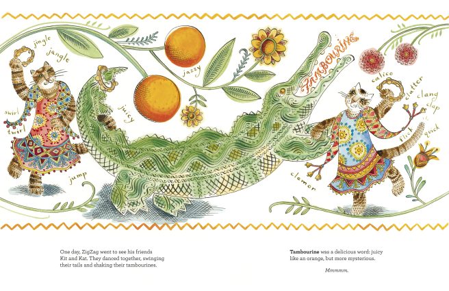 All was peachy until the day Zigzag vigorously danced with his friends Kit and Kat. They swung their tails and shook their tambourines. Because tambourine just happened to be especially delicious (“like an orange, but more mysterious”), Zigzag forgot himself. Gulp! He accidentally swallowed the word with all of its vowels!