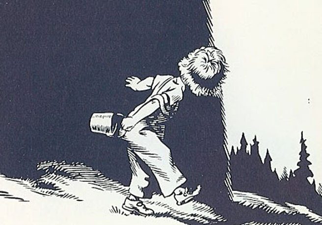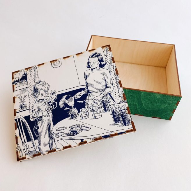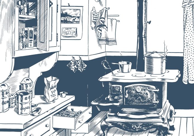 But the endpapers? A nostalgic kitchen scene that beautifully depicts the heart of the home. Did you know the wood stove actually belonged to McCloskey’s mother-in-law Ruth Sawyer (herself an esteemed children’s book author)? From the polka dot curtains to the tiny kitten to the vintage egg beater in the drawer to the rubber canning seals on Sal’s arm — this is a picture for the ages.