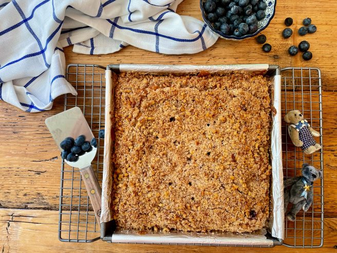 - Use a silicone spatula to scrape half of the batter into the prepared baking pan. Sprinkle evenly with the sugar-flour mixture (the one without the nuts and butter) and top with the blueberries. Cover with the remaining batter, smoothing out the top. Scatter with the nut-and-butter streusel topping.