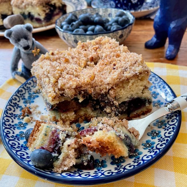 Though the recipe required more mixing bowls than usual, we had fun making the batter and streusel topping, then layering everything. This cake’s nice for breakfast, a snack, or dessert, and goes well with coffee, tea, or a cold glass of milk. We’re sure the people and bears in your house will like it. 🙂
