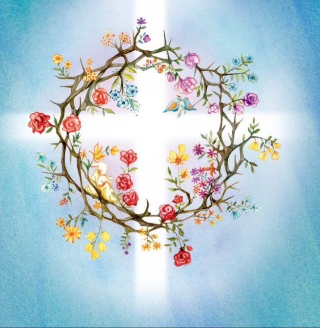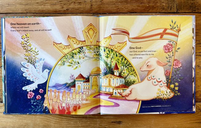 Her final double page spread showing God’s Kingdom is breathtaking: a majestic gold crown frames His heaven on earth with worshippers filing into His house. A dove and lamb grace each side of this eternal circle, along with flowers in clusters of three (Holy Trinity).