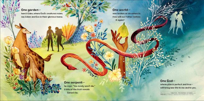 If only there had been a picture book like One Perfect Plan: The Bible’s Big Story in Tiny Poems by Nancy Tupper Ling and Alina Chau (WaterBrook, 2023) to help me figure out how to approach such an intimidating tome! I would have had a beautifully illustrated lyrical roadmap of sorts — an appealing introduction to some of the best stories told within the context of the Bible’s larger message.