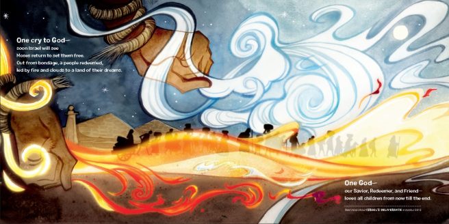 Loose lines and fluid curls also depict the movement of air, the floating of clouds, the licks of flames. Light, which represents the presence, direction, and guidance of God, is artfully incorporated in many spreads — from the first time sunlight “breaks into darkness” in Genesis, to depictions of stars in the sky (especially the Star of Bethlehem), to a joyous sunrise as Jesus restores sight to Jairus’s daughter.