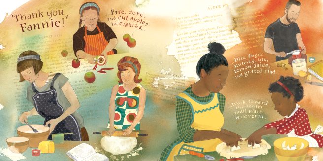 I was immediately charmed beyond belief! Susan put so much research and work into these illustrations. The period details are just enchanting. I can lose myself in a spread, examining the cooking utensils, clothing, and household items. One of my favorite spreads shows women throughout the decades working on the same apple pie recipe.