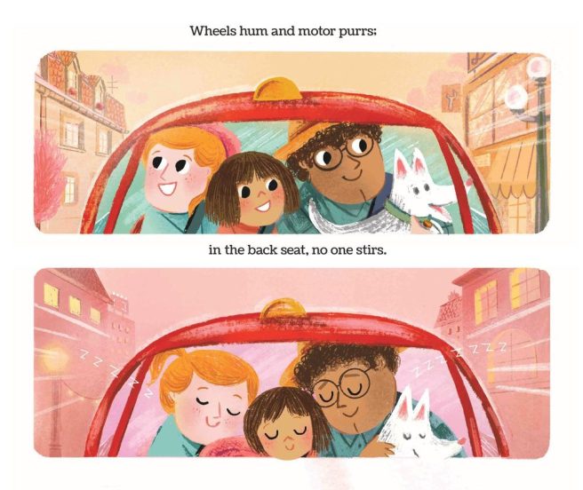 Taxi crosses a bridge, passes a park, and arrives at a street “still and dark.” He gently stops once more to help the family to their door. Taxi then makes his way back to the depot, where he parks, dims his lights, turns off his motor. After a full, eventful day and a job well done, it’s off to dreamland for him.