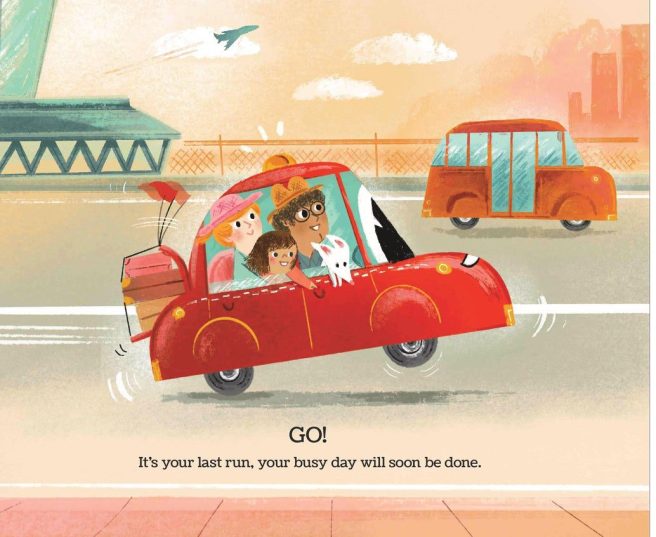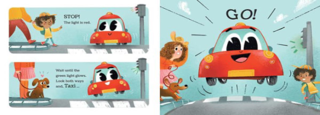 Toht’s pitch perfect rollicking rhyme is such fun to read aloud, and readers will enjoy riding along from page to page with every STOP! and GO! She’s incorporated lots of details about how taxis operate, from roof lights, to meters counting miles with their “tick, tick, ticks,” to how they navigate traffic at stop lights and intersections, etc.