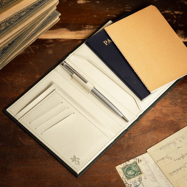 They come in two sizes — the smaller one measures 4.25″ x 3″ and has 4 credit card slots, a cash/receipt flap, and a pocket for coins. The larger passport wallet is 4″ x 5.5″ and also includes a pen and Kraft notebook. Both have clothbound covers and vegan leather on the inside.