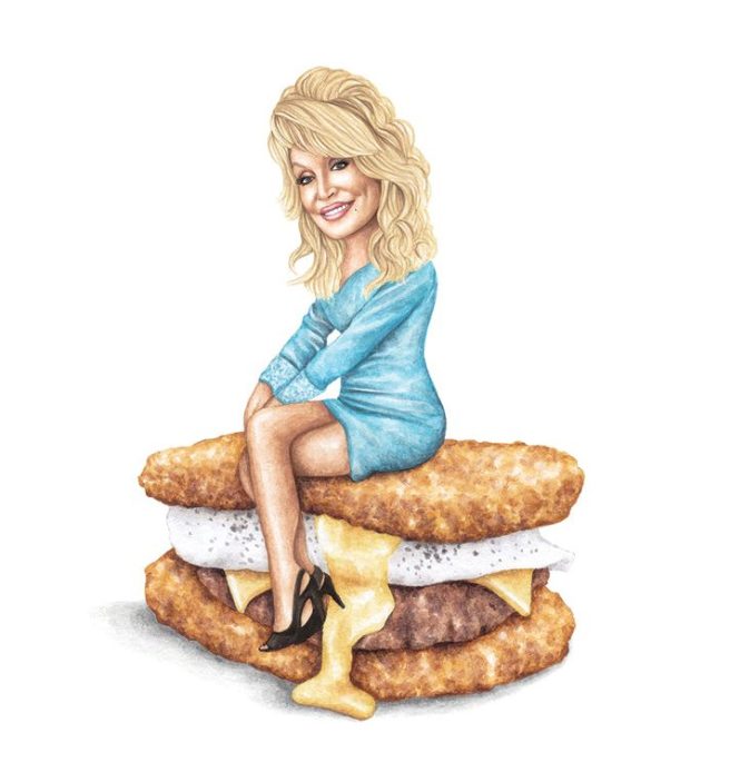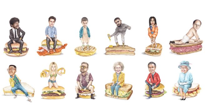 It’s been about 8 years since we first featured Jeff McCarthy’s humorous depictions of celebrities perched atop all manner of mouthwatering sandwiches, and thought it was time to share some of his latest offerings.