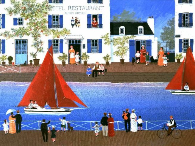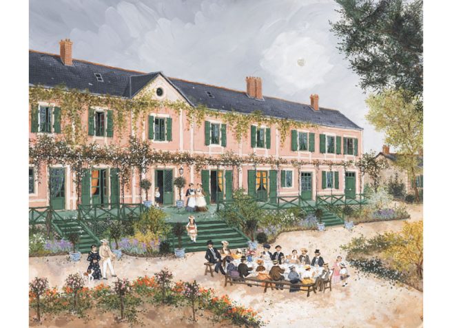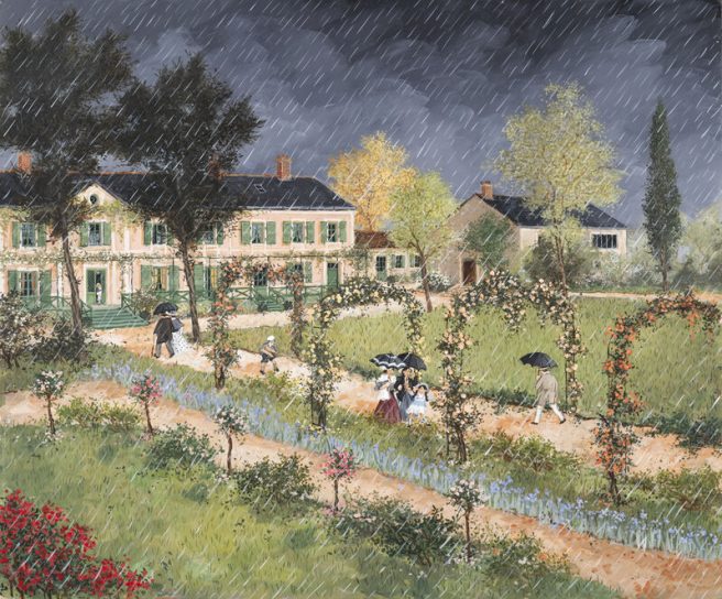Though she also works in watercolor and gouache, she favors acrylic on wood board. Her pieces cover a wide range of subjects and emotions, from quiet domestic interiors, to convivial park scenes, to serene rainy days and luminous seascapes and harbors. Her night scenes showing streets glistening with rain are decidedly evocative, and she also excels at capturing the spirit of the changing seasons in a quieter, more quaint vision of the past. I especially love her “Four Seasons in Giverny” series.