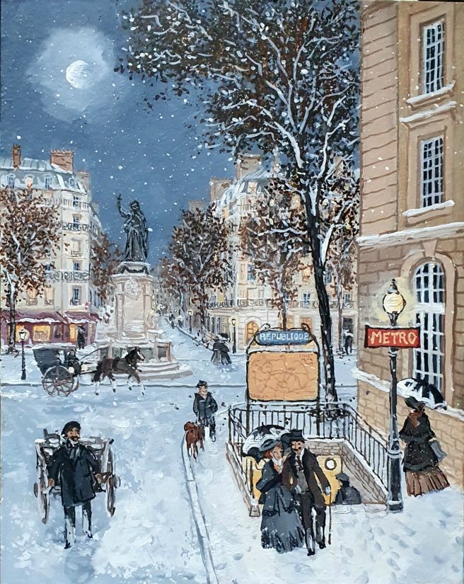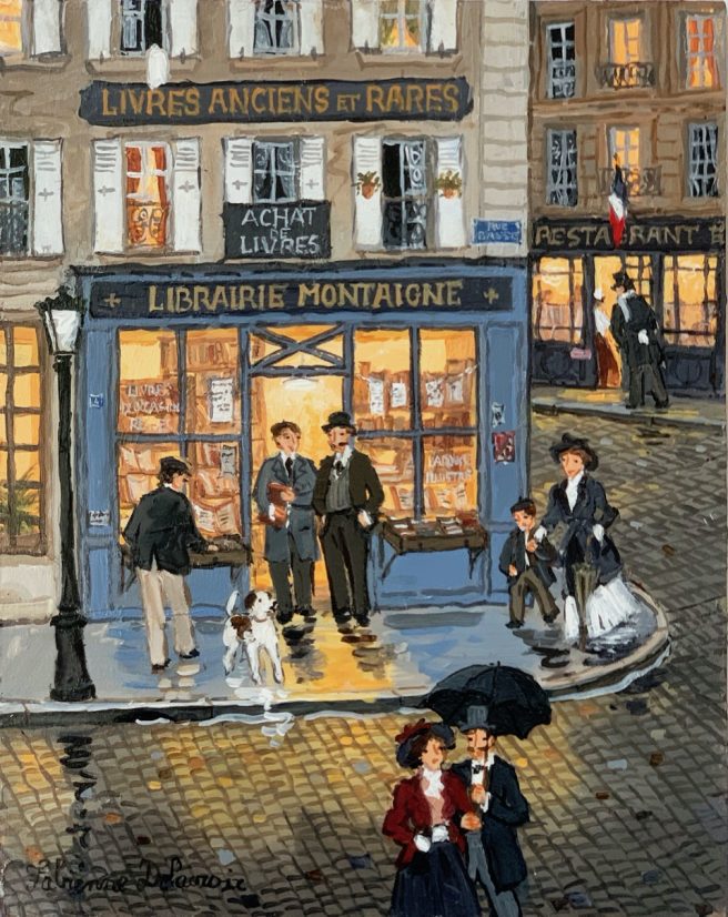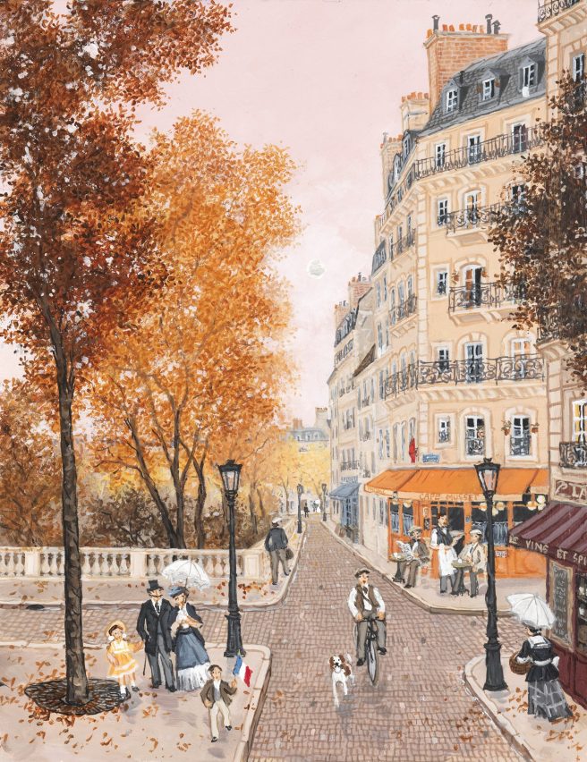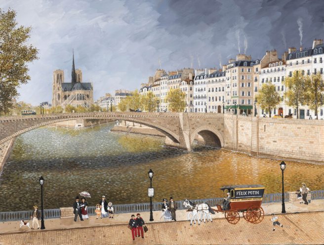 Fabienne actually first became known for her pastoral landscapes and seascapes, while her father was celebrated for his Parisian cityscapes. When he retired from painting in 2014, he passed his legacy on to Fabienne, who then expanded her content to include Paris city streets. Their work shares some stylistic elements — depicting old Paris with horse-driven carriages, etc. — but Fabienne paints with her own signature flair and has distinguished herself as a unique artist in her own right.