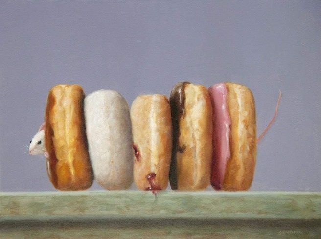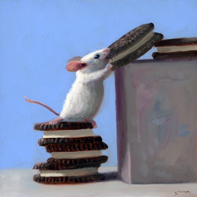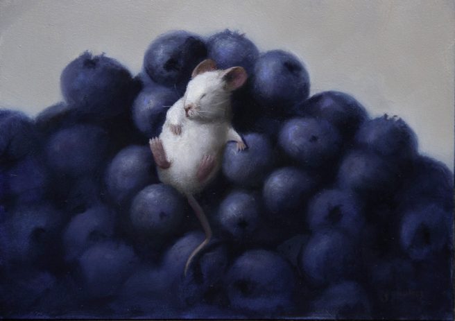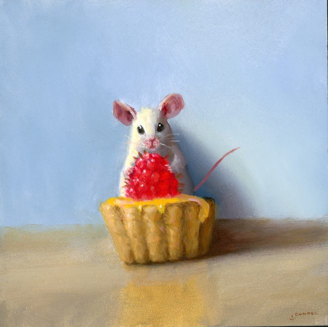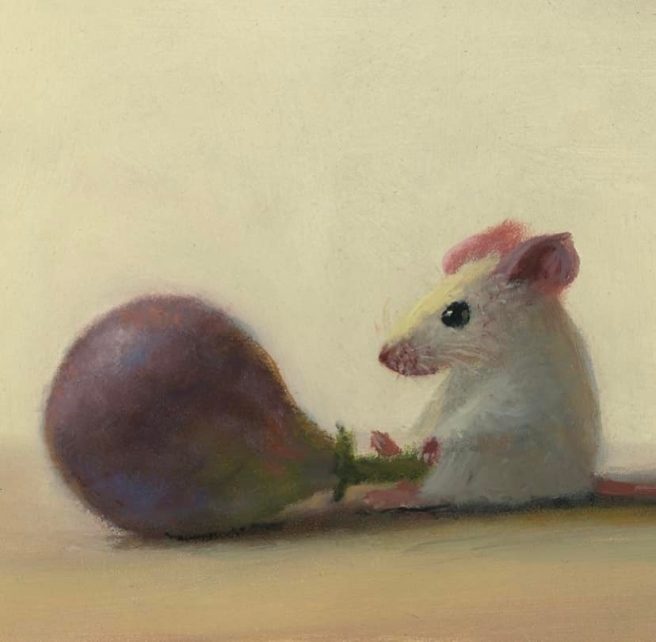 Stuart’s work is collected by enthusiasts across the country. He calls his mice paintings “a magnificent obsession.” Just one mouse with one object, but a lot of story to tell. What else does he like to paint besides mice? Giant fruit tarts. My kind of artist. 🙂