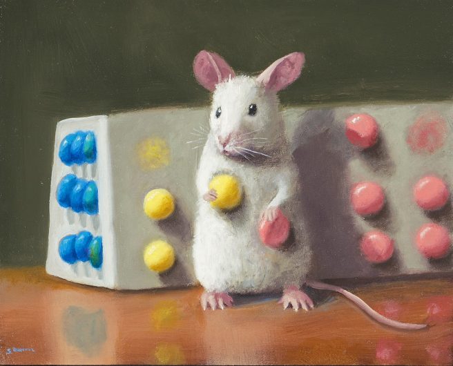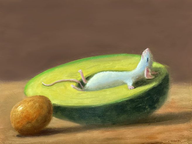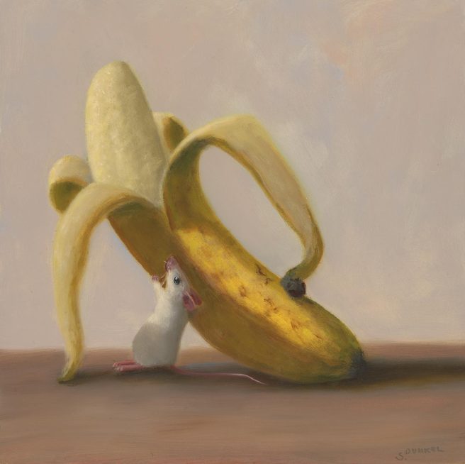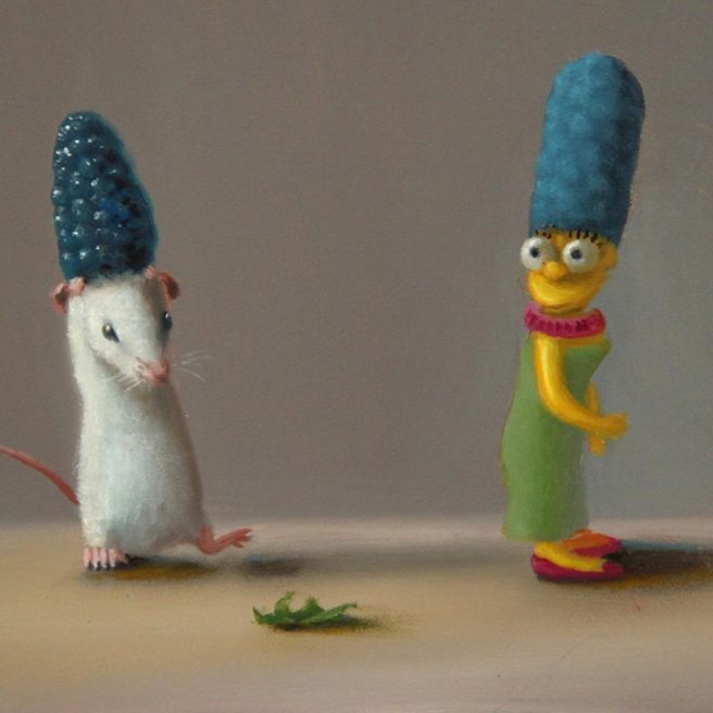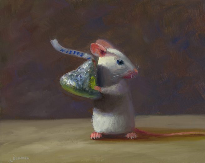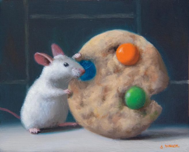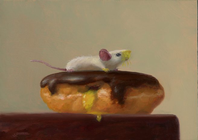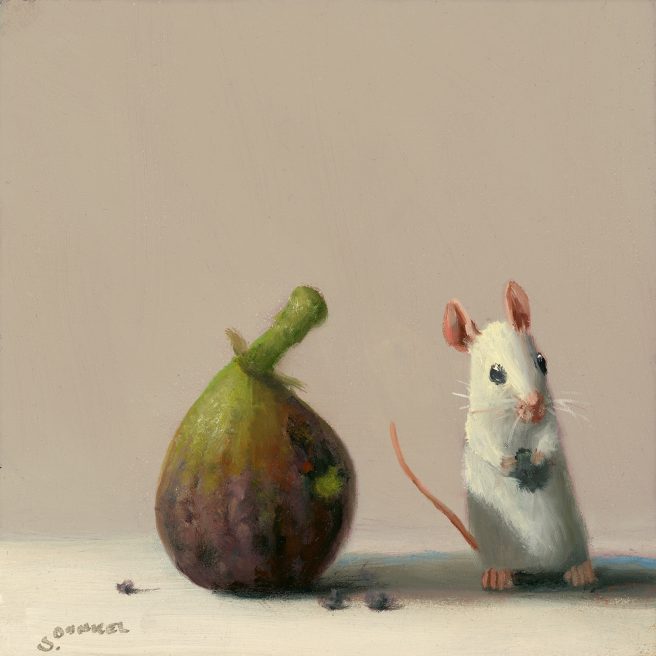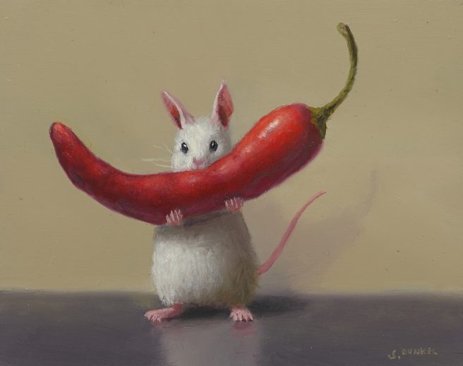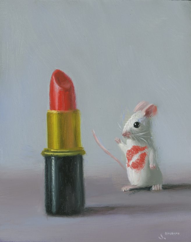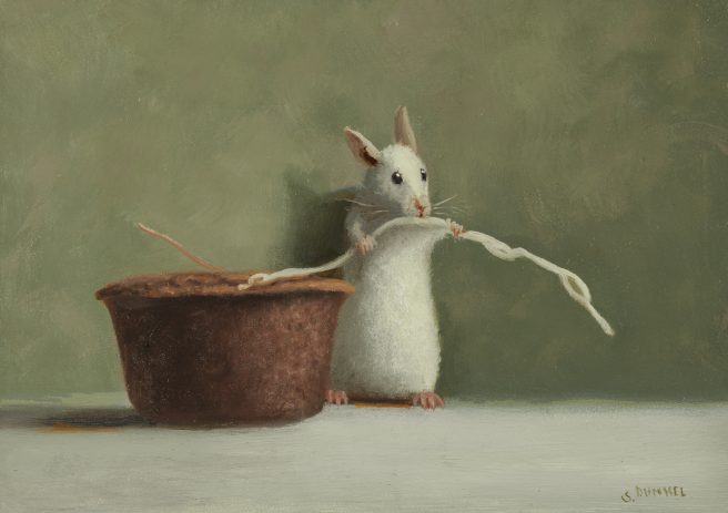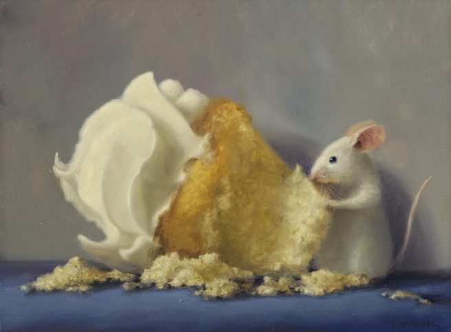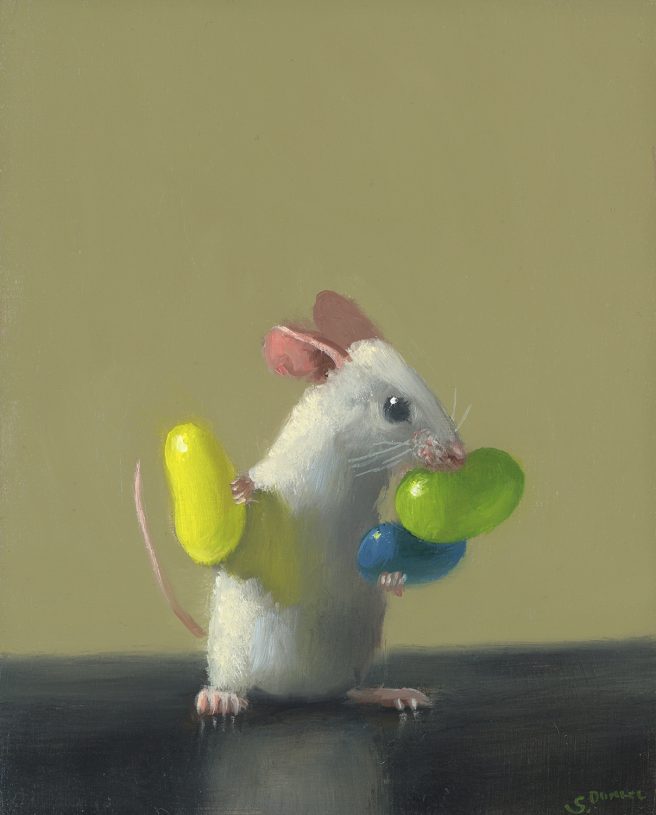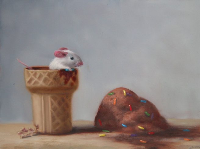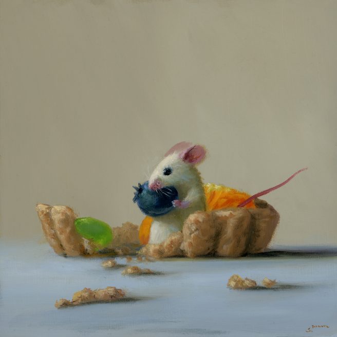 He considers his paintings autobiographical, as he tries to channel the mouse’s emotions. His realistic paintings are inspired by the Dutch masters with a unique touch of whimsy and subtle humor. They reflect his personality, which he describes as mischievous and a bit goofy.