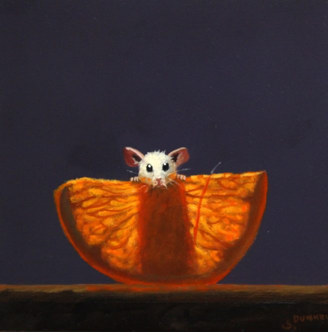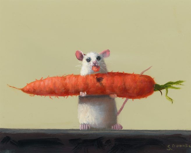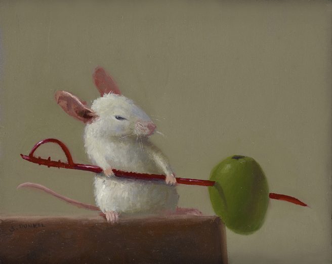 Dunkel’s mice paintings are enjoyed by young and old alike. A mouse protagonist appeals to him since mice are the smallest and most vulnerable of animals that reflect the same issues humans have to deal with.