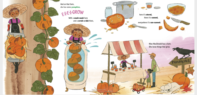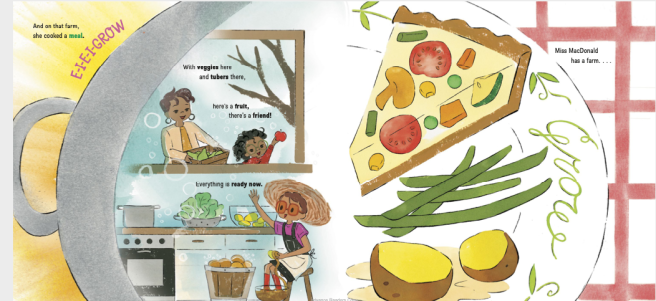 They’ll also admire Miss MacDonald’s dedication, industry and enthusiasm, perhaps being able to imagine her pride and satisfaction at reaping the rewards of her labor. Best of all, they’ll enjoy the final outcome of this story: Miss MacDonald cooking a meal to share with her friends. I love the final double page spread showing a diverse group of guests feasting on dishes made with all the vegetables from the farm.